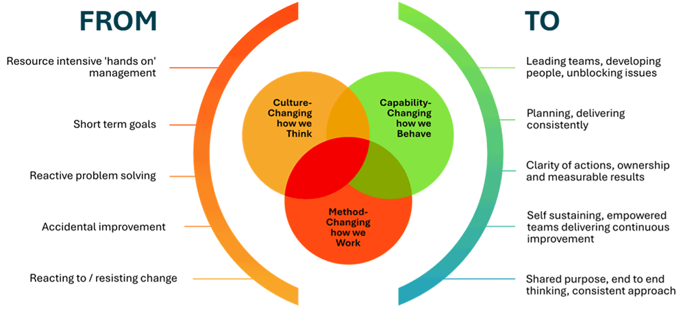 - Changing how we behave (which happens as a result of learning how to deliver continuous improvement).